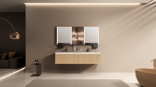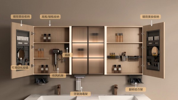 镜柜一体,智在从容:专为美妆设计的智能镜柜,双侧无频闪护眼级灯光精准还原自然光色,助力精致妆容。镜面中枢触控面板集成温度、时间显示,灯光模式、无极调光、快速除雾、自动关灯一键掌控,随心定义光环境。搭载镜背3.0智能收纳系统,分区合理,错层设计提升效率,晨间梳妆一步到位,收纳琐碎,承载品质追求。