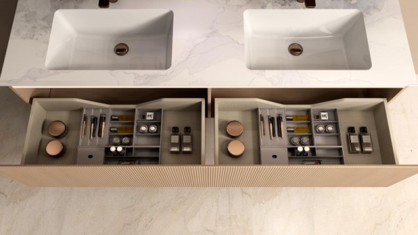 藏纳有序,从容有度: 双抽设计高效利用垂直空间,收纳率倍增。亮光岩板台面映衬实木肌理,美观易洁,细节考究,让生活更显从容。