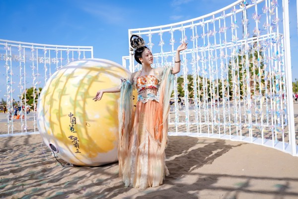 游客打卡九牧“月满敦煌 风生水起”艺术装置