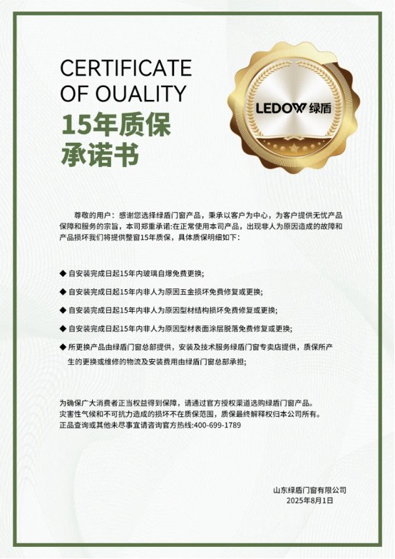 科技创新引领行业发展,绿盾首创的自洁净醛技术,向客户承诺承诺整窗15年超长质保服务,更是保证15天快速入住,在消费升级与健康需求双重驱动下,这份质保承诺书,既是绿盾对自身产品的信心,更是有让消费者安心的底气。