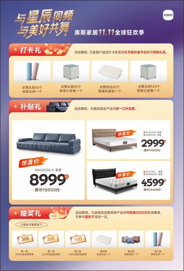 为增强用户参与感,库斯家居在本次11.11全球狂欢季中精心设计了多重互动环节,覆盖线上线下,力求让每一位消费者都能在活动中找到属于自己的惊喜。