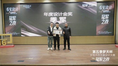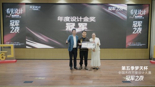 随后,赛事进入了最激动人心的环节——比赛成绩公布及颁奖。最终,金锐军以总得分94.44分的成绩夺得本届“看见设计”梦天杯全国木作方案设计大赛总冠军。由梦天家居总经理余静滨、杭州壹玺装饰设计工程有限公司创始人王疆甯为其颁发“年度设计金奖”并合影。