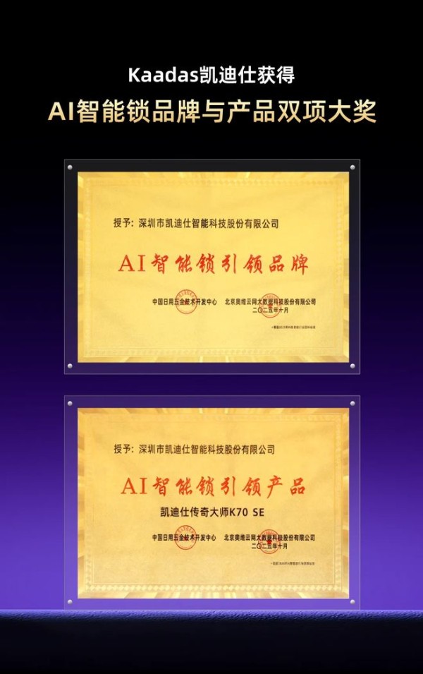 展会期间,在由奥维云网(AVC)与中国五金制品协会联合主办的“第一届AI智能锁行业发展峰会”上,Kaadas凯迪仕凭借其全场景AI技术布局、市场领导力及卓越用户口碑,成功获评“AI智能锁引领品牌”。凯迪仕传奇大师K70 SE因在AI安防性能与用户体验优化方面的突出表现,荣获“AI智能锁引领产品”等多项权威认可。