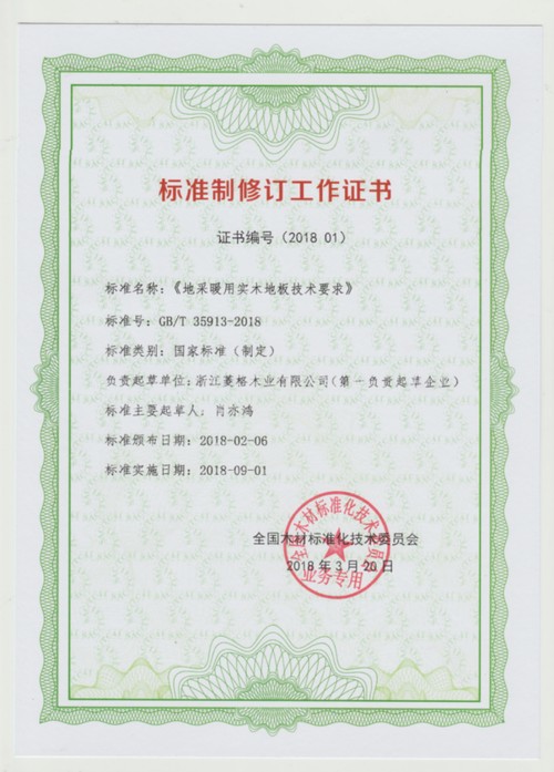 从缔造品类到建立秩序,天格同样展现了“品类为先”的领导者格局。2018年2月,《地采暖用实木地板技术要求》即地暖实木地板国家标准正式颁布。在标准的制订过程中,天格无私贡献了自己多年来积累的技术数据,参与制定的标准内容超过60%,成为名副其实的国标第一负责起草企业。该标准也是全球范围内首个地暖实木地板品类的的国家标准。