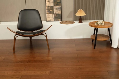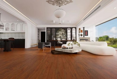 这款山核桃地板呈胡桃色,纹理如同水墨画一般自然流淌,沉稳大气,适合轻奢风、中古风、复古风空间。