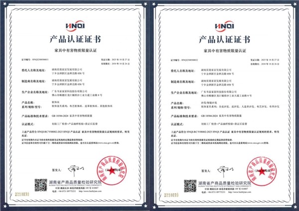 近日,星港家居以其卓越的环保品质,为消费者带来了这份笃定的安心。继其床垫产品荣获湖南省首张《家具中有害物质限量认证》证书后,乘势而上,其沙发、软床等全线软体家具产品,已获得《家具中有害物质限量认证》证书。