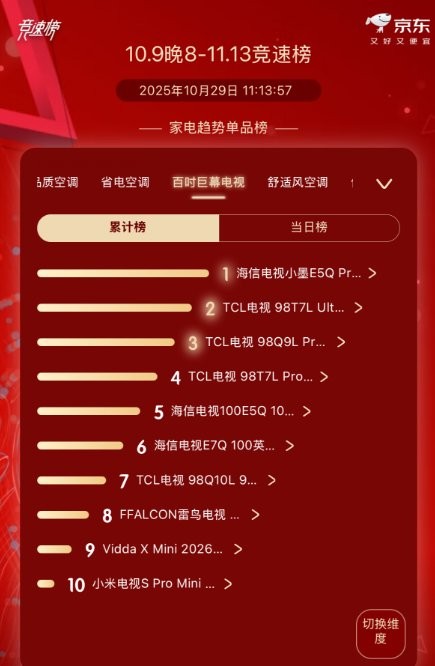 在秋季新品发布会上,除了RGB-Mini LED双旗舰,海信还发布了E7Q系列,搭载信芯AI画质芯片H6超频版、4224个物理背光分区以及支持4K 170Hz原生高刷黑曜屏Pro,多项配置均领先行业。双11京东竞速榜显示,海信电视在百吋巨幕电视榜占据三席,其中海信电视小墨E5Q Pro登顶Top1, 海信电视E5Q、海信电视E7Q分别位列第五、第六名。