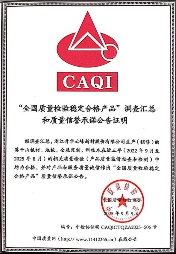 近日,云峰莫干山再获权威认证——中国质量检验协会正式为浙江升华云峰新材股份有限公司颁发“全国质量检验稳定合格产品”公告证明,认定莫干山品牌旗下板材、地板、全屋定制、科技木四大品类产品,在2022年9月至2025年8月近三年间,经第三方监督抽查、质量监测及检验检测,均保持合格记录,并对产品和服务质量诚信作出公开承诺。这份认证,既是对云峰莫干山长期坚守品质的权威见证,更是对云峰莫干山“以质立身”理念的有力印证。