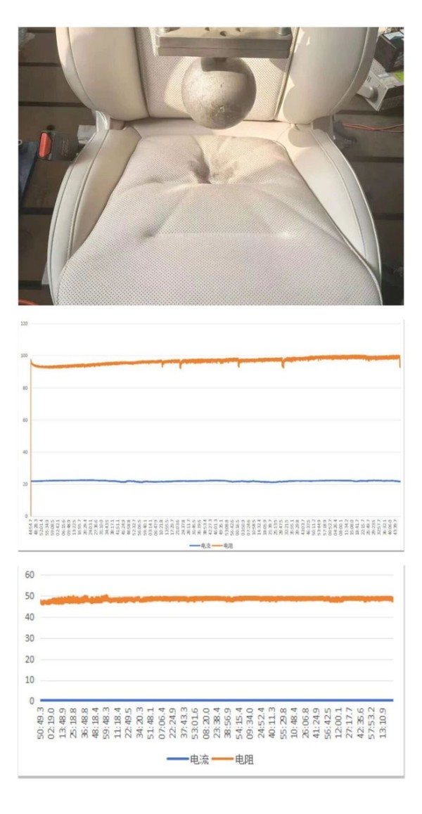 跪压测试是衡量汽车座椅加热膜耐久性与稳定性的核心指标。当前,行业普遍执行的标准为750N/1.5万次至2万次,而海骊新材料将这一门槛直接推高至“900N/5万次”——在持续的高频次疲劳测试中展现出卓越的产品稳定性。