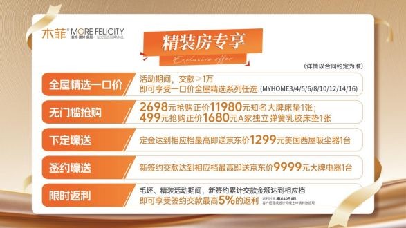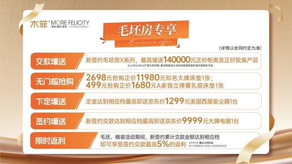 木菲特意准备了开业专属福利(即日起至2025年11月30日)到店预约您的专属客户经理即可免费领取 AI 全套设计方案,设计师免费上门量房,免费出专属效果图以及精准报价,生成专属方案;以及参与木菲“十月金秋家装节”的优惠活动:2698元无门槛抢购正价11980元大牌床垫;签约壕送万元大牌电器;集团柜类、软装补贴,全单返利最高5%等超多优惠活动!