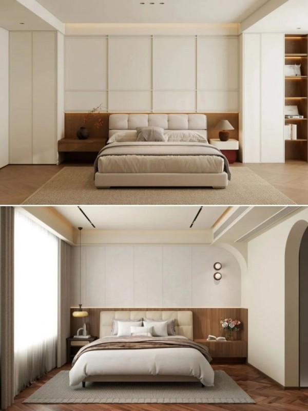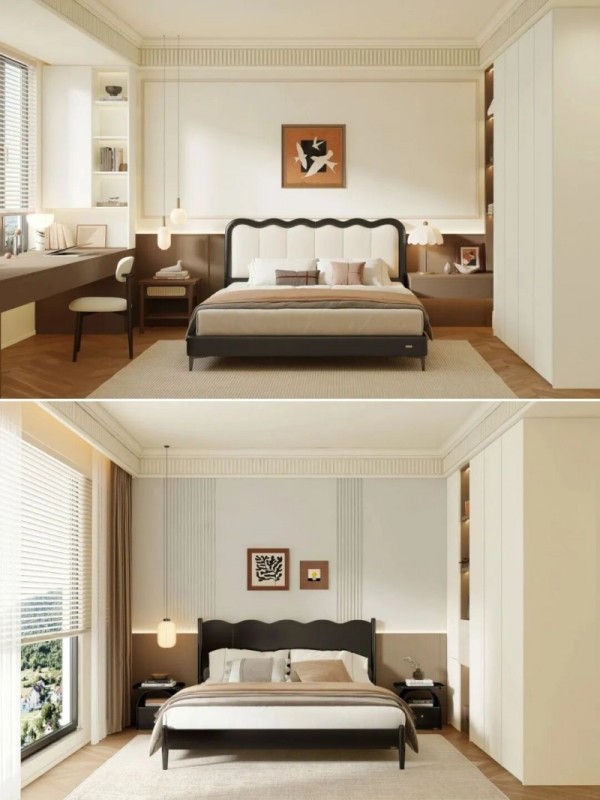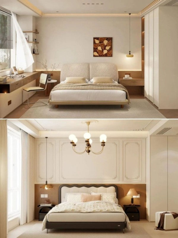 想要营造卧室的温馨感与松弛氛围,首选奶油色、米杏色等低饱和度浅色调。