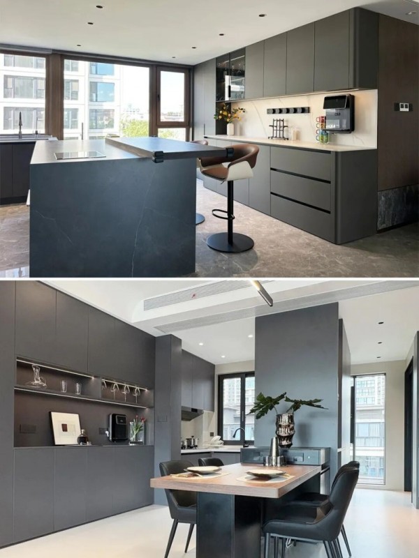 浅色系门板搭配深色系开放格,经典撞色设计营造出丰富的视觉层次。若钟爱意式极简风格,深色门板是彰显高级质感的不二之选。
