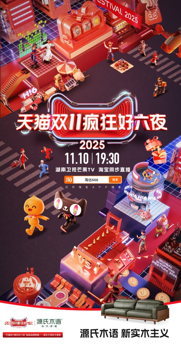 天猫双 11 “疯狂好六夜” 作为双十一期间现象级娱乐营销 IP,推出 8 小时不间断直播,融合走秀、综艺游戏、明星互动、品牌福利等多元内容,打造 “登疯造集” 的沉浸式狂欢场景。源氏木语的强势加入,不仅为这场娱乐盛宴注入 “健康家居” 的品质内核,更让原本沉稳内敛的实木家具,在明星互动与综艺游戏中焕发全新活力。