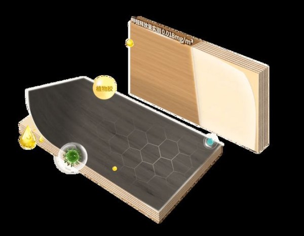 纳米无醛植物胶技术:通过纳米改性手段,制作成为纳米改性的活性二氧化硅,与天然可再生的木薯淀粉进行改性复合,成功研发出纳米无醛植物胶。纳米无醛植物胶无醛无苯、固体含量高、流动性好工艺适应性强,实现了胶合强度、工艺效率、与成本的完美统一,解决了传统多层板无醛化工艺匹配难、效率低、成本高的三大痛点;