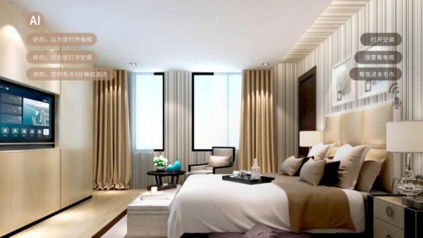 TCL智慧酒店解决方案的核心优势在于其真正实现了一体化智能。借助TCL酒店电视所搭载的AI大模型技术,旅客步入客房瞬间,电视启动欢迎界面,灯光、温湿度、窗帘自动调节至舒适状态;入住期间,旅客根据自身需求,通过语音即可轻松控制全屋设备,实现空调、灯光、窗帘等设备的无缝联动,无需反复起身调试。这种全场景智能不仅优化了住客体验,也显著提升了酒店的运营效率。