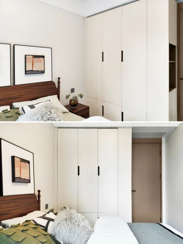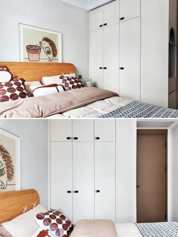 顶天立地式衣柜设计,造型简约耐看,同时避免了顶部积灰问题。衣柜侧面贴心设置了开放格,可用于收纳次净衣,保持空间整洁的同时,也方便了日常生活。