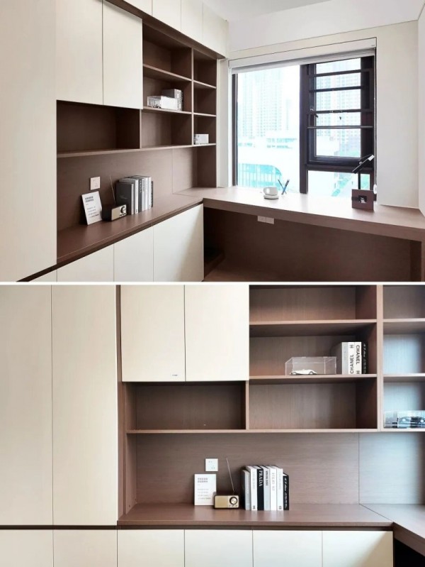 一侧打造整墙书柜,充分收纳书籍与摆件。转角处延伸出悬浮台面作为书桌,即便两人同时办公学习,也不会感到拥挤,有效提升了空间利用率。