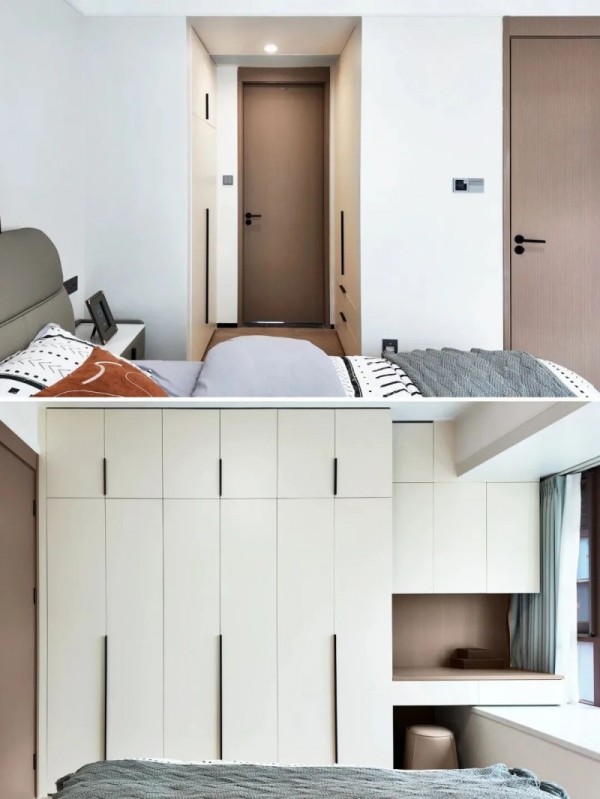 床头利用短走廊空间,定制了步入式衣帽间,充分满足储物需求。床尾则规划了整墙衣柜与梳妆台,四季衣物与被褥都能有序收纳。化妆与换衣的动线一气呵成,流畅而高效。
