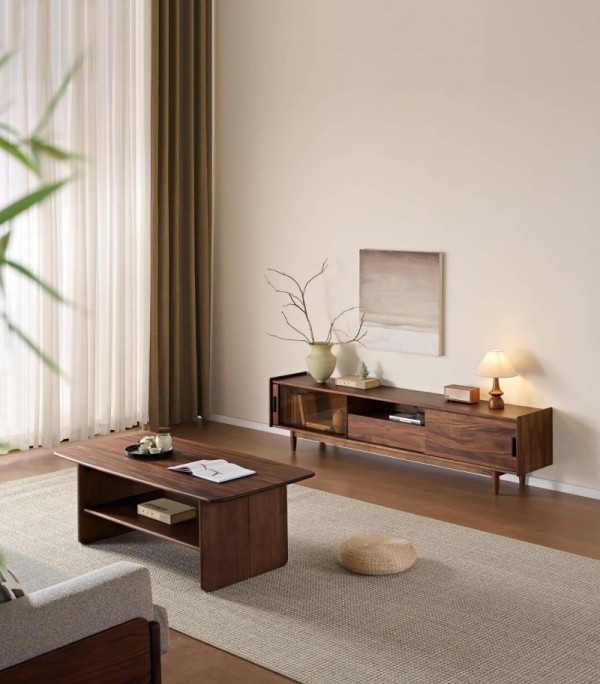 东方风实木电视柜,线条利落平直,摒弃多余装饰,玻璃与实木柜门混搭收纳,适配多种装修风格。主材选用南美胡桃木,色调温暖典雅,材质耐用不易变形,实木底脚稳固承托。茶几采用全开放式双层设计,通透不压抑空间,更显轻盈灵动。