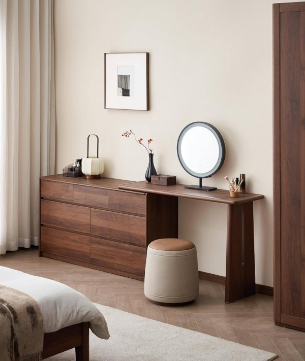 经典胡桃木纹,自带复古质感与中式韵味,不易过时。独特七斗柜错落设计,规划出更多收纳分区。搭配专用斗柜搭架,灵活变身书桌、妆台,角度可自由调节,适配多空间使用场景。无拉手设计简洁耐看,提升美观度,搭配搭架倒圆设计,避免日常磕碰。
