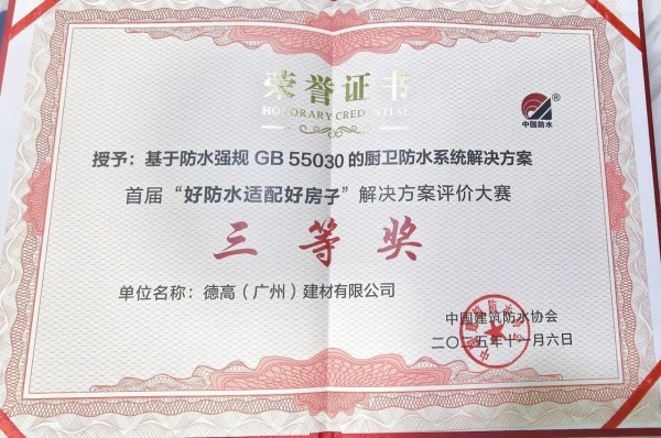 近日,在由中国建筑防水协会主办的首届“好防水适配好房子”解决方案评价大赛中,西卡德高《基于防水强规GB 55030的厨卫防水系统解决方案》荣获三等奖。
