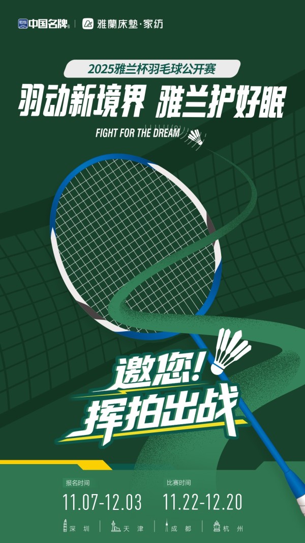 2025雅兰杯羽毛球公开赛将于11月22日在深圳启动首场比赛,11月29日、12月6日、12月13日陆续登陆天津、成都、杭州,并于12月20日在深圳举行总决赛。届时,“雅兰运动睡眠体验官”黄雅琼将亲临现场。赛事现面向全国公开报名,欢迎广大羽毛球爱好者积极参与,共同体验“适度运动”与“优质睡眠”相结合的健康生活。