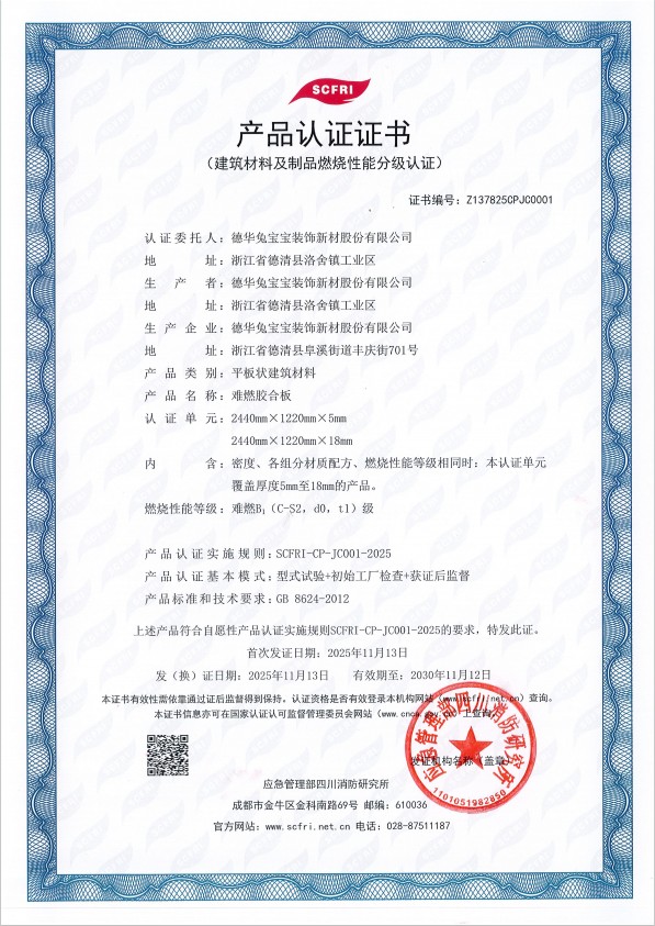 在这一高标准社区中,兔宝宝难燃胶合板作为室内装修的核心建材,为建筑安全注入了硬核基因。产品率先获得由应急管理部四川消防研究所颁发的行业首张难燃B1级证书,“含金量”十足,标志着兔宝宝的产品防火等级从“合规”迈入了“领先”的新阶段,为高端住宅的消防安全提供了更高等级的保障。
