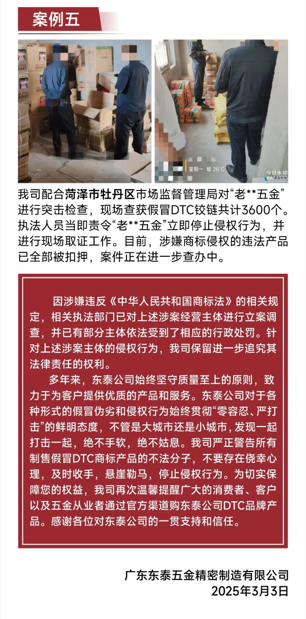 横跨五省,有假必打 — 东泰五金协助执法部门查处十多家售假点