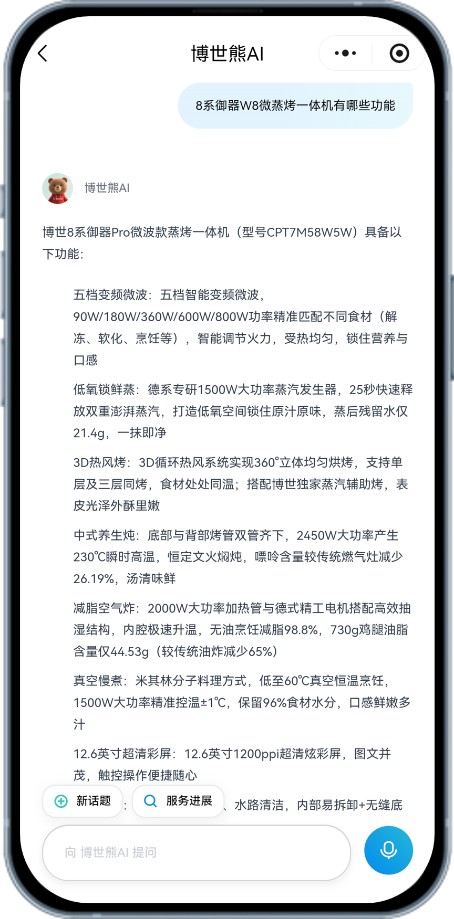 家电产品的“使用旅程”长达数年甚至十余年,期间的疑问、调试与维护需求虽琐碎,却直接影响着体验与产品的生命周期价值。传统依靠说明书、断续性在线搜索或周期性客服支持的方式,往往存在信息碎片化、不及时的痛点。“博世熊”作为一部实时更新、交互智能的“家电百科全书”,将专业支持无缝嵌入日常使用场景。无论是操作疑惑(如“微蒸烤一体机的组合烹饪模式如何设置”)、功能探询(如“沸石烘干技术的核心优势是什么”)、保养咨询(如“洗碗机滤网多久清洗一次”),还是故障预警(如“洗衣机显示E32代码应如何初步排查”),“博世熊”都能提供即问即答、步骤清晰的指导。