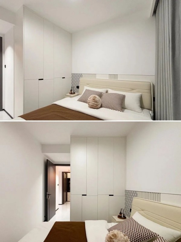 两间次卧保持了统一的简约风格。衣柜门板采用错位分段式设计,中间预留的凹槽巧妙充当免拉手,创意十足,充分满足细节控的审美喜好。