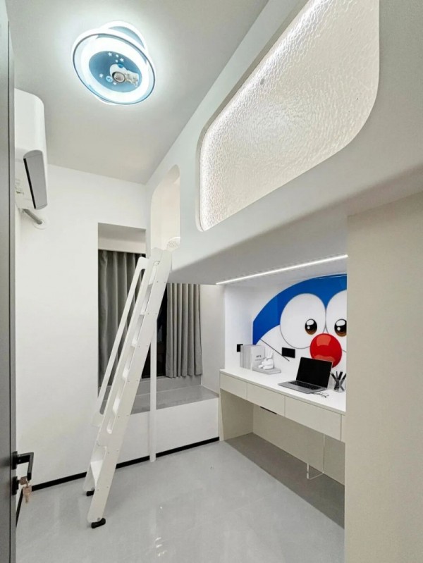 采用“上床下桌”的宝藏布局。上层是透光不透影的树屋式睡眠区,兼顾安全与趣味。下方是书桌与书柜的一体化定制,将学习、睡眠与收纳功能高效整合。