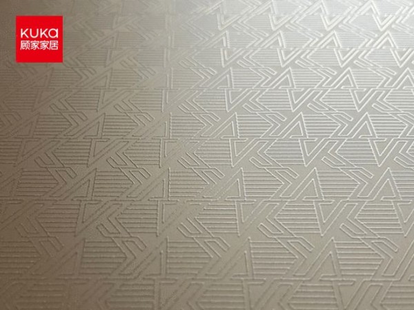“流光溢彩·环保7号板”以“KUKA顾家家居"品牌标志中的“K”为视觉锚点,通过线条解构与45°斜向重组形成核心纹理。运用叠彩印刷技术,通过微米级油墨厚度调节打造简奢细节,有效融合品牌基因与实用美学,强化用户品牌认知。