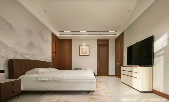 卧室以澄澈留白铺陈底色,皮阿诺天然木皮系列的暮冬灰、北美黑胡桃色为空间注入温润肌理。床头泼墨山水壁画与木皮的原生质感相得益彰,胡桃木皮与暖调皮艺在光影中交织,将传统意蕴藏于现代简素之中。天然木皮的低饱和度特质,让空间远离喧嚣,为睡眠营造出宁静氛围,而稳固的铝蜂窝复合基材则保障了家具的耐用性,让私享场域兼具舒适与持久。
