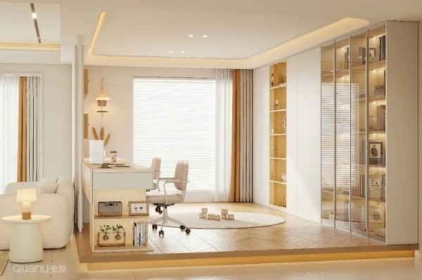 若想拥有一个更沉浸、独立的办公区,可将整个区域抬高做成地台。