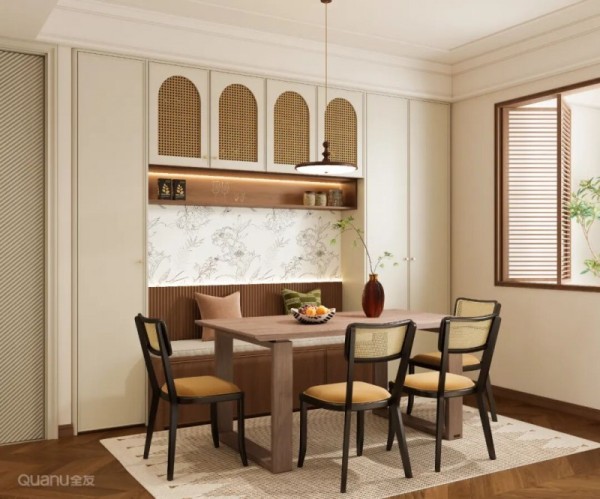 用卡座替代传统餐椅,节省空间的同时,底部设计封闭式储物空间,实现坐卧+储物双功能。