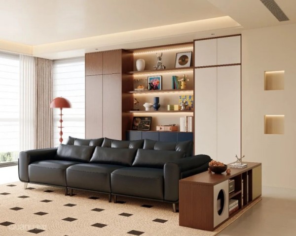 对于小户型而言,在沙发背后选用定制柜作为隔断更为高效,既能实现空间分区,又能大幅增加收纳容量。