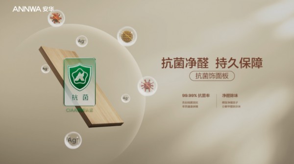 安华始终将健康与耐久置于产品核心。安华“宋影”系列柜体采用E0级环保板材,表面覆以抗菌净醛饰面板,抗菌率≥99.9%,净醛率>75%,主动守护家庭环境健康。五金细节上,选用二段缓冲不锈钢铰链,实现轻柔开合与静音缓冲,经过5万次开合测试,远超国家标准,确保产品历久弥新。