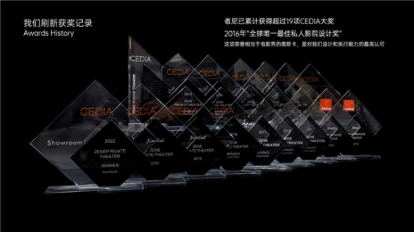 者尼累计获得19项CEDIA(定制电子设计与安装协会)国际大奖,包括12次亚太区金奖、6次亚太区银奖,更在2016年美国达拉斯全球评选中,从300多个项目里突围,以"星球大战主题私人影院"摘得全球"BEST HOME THEATER"总冠军,让中国智能影音设计与家庭影院项目登上国际顶 尖舞台。