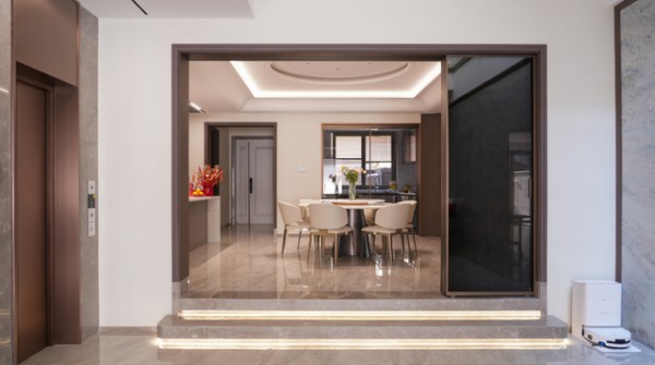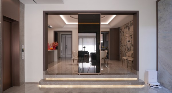 ZMKM四扇互推吊轨门的便利性,体现在两个至关重要的细节革新上。首先,它彻底解放了地面。采用先进的吊轨承重系统,地面再无任何轨道凸起,实现真正的“一拖到底”。无论是家人频繁通行,还是孩子嬉戏玩耍,或是清洁打扫,都畅行无阻,彻底告别了积灰死角与磕绊风险。其次,它净化了顶部空间。轨道并非简单外露,而是做了全埋式处理,并用精致的扣盖完美收口。抬头望去,只能看到四条极致简约、干净利落的线性缝隙,如同精心勾勒的天花线条。这种“隐形”的极简处理,让空间顶部利落无比,视觉上毫无杂乱,体现了品牌对细节的苛求与对简约美学的深刻理解。