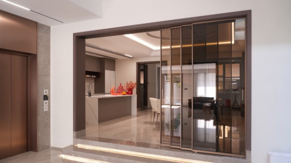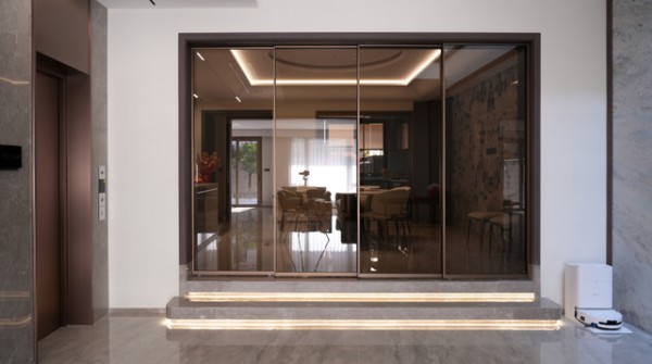 ZMKM四扇互推吊轨门深谙此道。它整体采用同色系设计哲学,魔力咖拉丝型材质感温润而现代,搭配色调高度统一的茶色玻璃。这种精心调配的搭配,让四扇门扇在闭合时,仿佛一面完整而连续的装饰墙,视觉上极度平整统一。它不再是空间中一个孤立的功能构件,而是化身为墙面的一部分,或是一件大气的立体艺术品,为客厅、餐厅或阳台的背景墙增添高级而深邃的层次感。无论家装风格是极简、还是现代轻奢,这面“会呼吸的墙”都能与之从容对话,提升整体空间的格调。