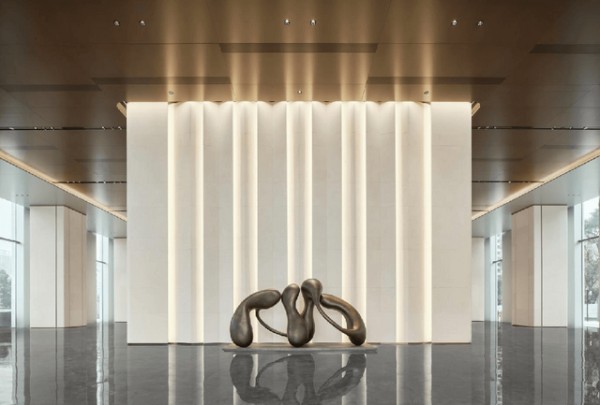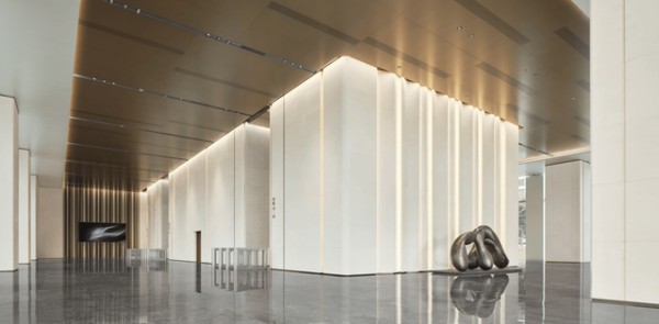 福城时代广场写字楼大堂以“简洁化、商务化、现代化”为核心理念,聚焦高端写字楼的功能本质与品牌价值赋能。8米挑高的大堂开阔通透,冷色调基底结合竖向线条设计,赋予空间强烈的视觉张力,巧妙放大恢弘气质;低饱和度莱姆石墙面与精细收口的金属线条彼此映衬,既营造出沉稳宁静的商务氛围,亦勾勒出纯粹简约的美学格调。