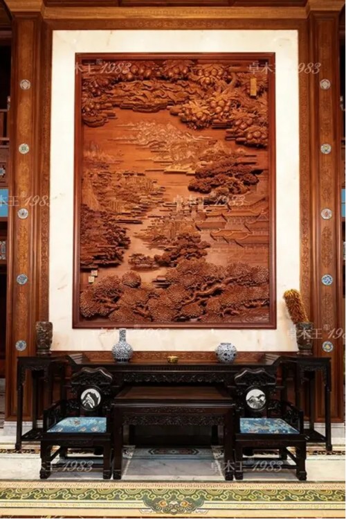 卓木王董事长、中国传统工艺大师杜承三亲自操刀设计多处木雕作品,以浮雕、圆雕、透雕等技法,赋予每一处细节丰富的文化寓意与极高的艺术价值。华堂中央缅甸花梨木雕《千里江山》屏风尤为夺目,寿桃累累、仙鹤翩跹,云纹流转如瀑,将“寿比南山”“松鹤延年”的美好寓意,深深镌刻进每一寸木肌理,尽显匠心与神韵。