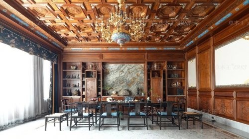 茶室尽显雅韵与气度:藻井式棋格天花板四角嵌景泰蓝,珐琅吊灯柔光漫洒。主人位后,缅甸柚木多宝阁直抵天花,天然大理石嵌于中央,精雕纹样暗藏雅致。紫光檀茶台、座椅线条流畅,尽显文人风骨。落地窗框入园林美景,海水江崖纹软包添宫廷韵味,品茗间尽是自然与匠心的交融。
