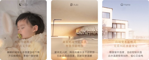 •自动变水温模式:随室外温度灵活自动调节,用户无需再纠结水温设定,省心又省电。