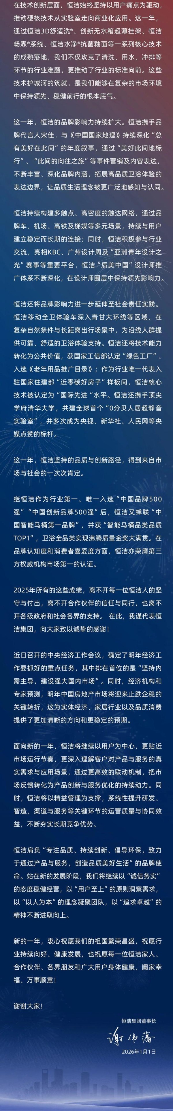 持质而行,进取向新 | 恒洁集团2026年新年贺词
