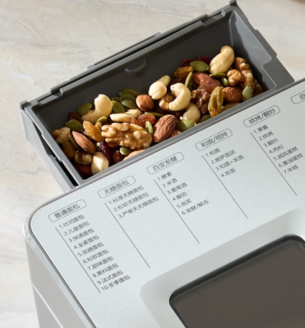 除了独立酵母盒设计,东菱面包机DL-1352还配备了自动撒果料功能。在面粉成团后,机器会自动将果料均匀投放至面团中,使得每一口面包都能品尝到丰富的果香,大大提升了口感层次。此外,600W大功率立体升温技术和3mm加厚压铸铝面包桶的组合,确保了面包六面同色,外酥内软,烤色均匀,让人一看就食欲满满。