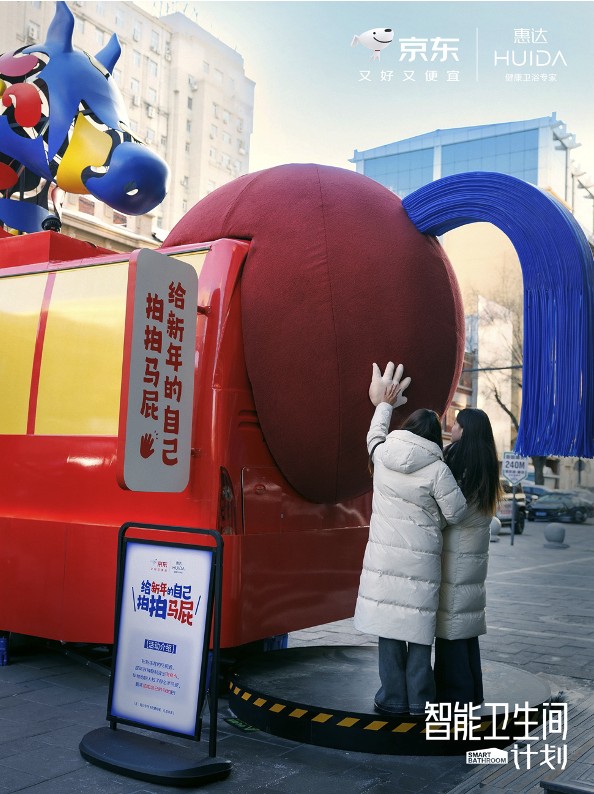 除了硬件设施的升级,游客在使用智能卫生间时,还可参与“京东厕评人”活动分享使用感受,即有机会赢取花洒、马桶趣味对联、京豆等礼品。卫生间后方设有“幸运马屁”互动装置,轻拍即可获取新年好运卡,让如厕过程也成为一段轻松趣味的体验。