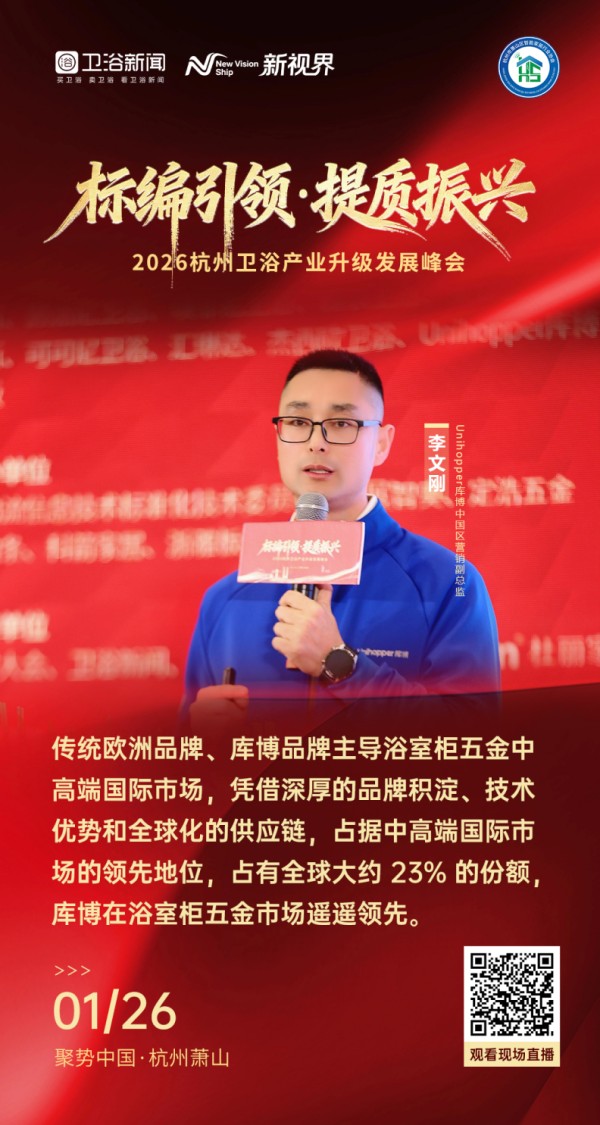 1 月 26 日,2026 杭州卫浴产业升级发展峰会在杭州隆重启幕。本次峰会以 “标编引领,提质振兴” 为核心主题,汇聚了国内外卫浴行业权威专家、头部领军企业负责人、产业链创新力量及主流媒体代表,围绕产区协同发展、品牌价值升级、供应链迭代革新等关键议题展开深度研讨,既是一场凝聚行业智慧的巅峰对话,更是推动 “杭州卫浴” 集体品牌崛起、擦亮 “浙江制造” 金名片的重要战略行动。