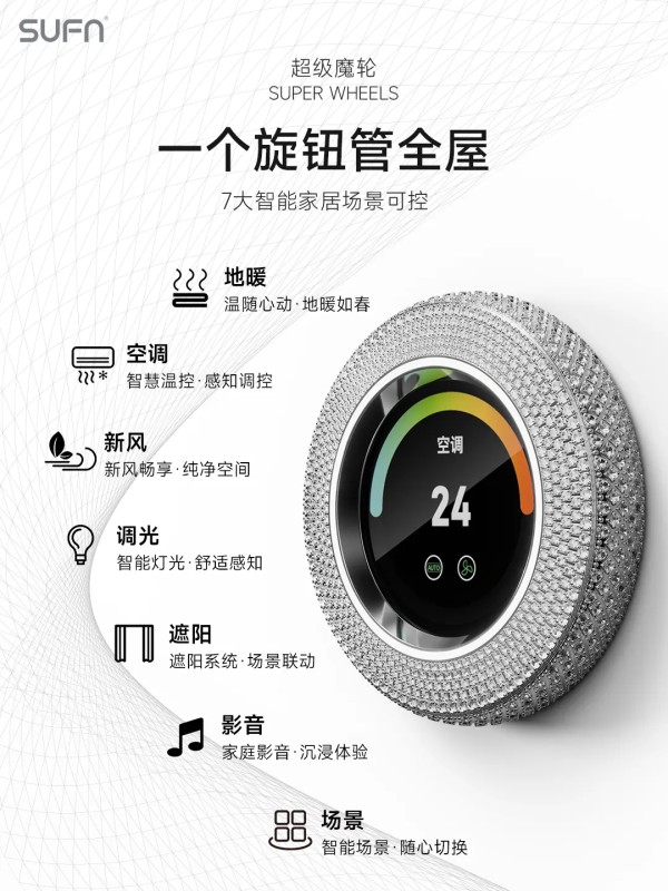 除了智慧内核,超级魔轮更是一件精美的艺术品。超级魔轮奢钻版采用与卡地亚珠宝同级的爪镶镶钻工艺,精心镶嵌512颗高品质水晶钻,在不同光线下折射出璀璨而柔和的光芒。它不仅是一个控制终端,更是墙面上的点睛之笔,能够显著提升空间的奢华质感与审美格调。这种将尖端科技与高级定制美学深度融合的设计理念,满足了高端用户对家居产品情感价值与身份象征的双重期待。
