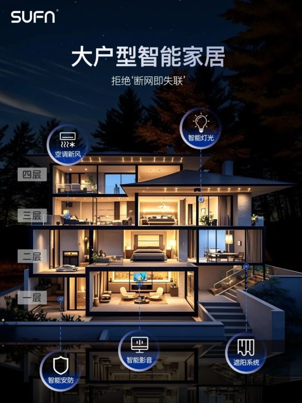超级魔轮的卓越体验,根植于三峰自主研发的SUFN OS智能家居系统。该系统拥有五大技术专利,其中尤为突出的是行业首创的本地化跨网关技术。该技术解决了多层别墅、大平层中常见的设备跨楼层控制延迟、依赖网络等问题。即使在没有集中网关、各楼层未配置独立路由的情况下,全屋设备仍可通过本地网络高效、丝滑地互联互通。这意味着系统彻底告别了“断网即失联”的尴尬,实现了真正稳定、可靠、响应迅速的智能控制,为全屋智能的落地提供了坚实的技术基石。